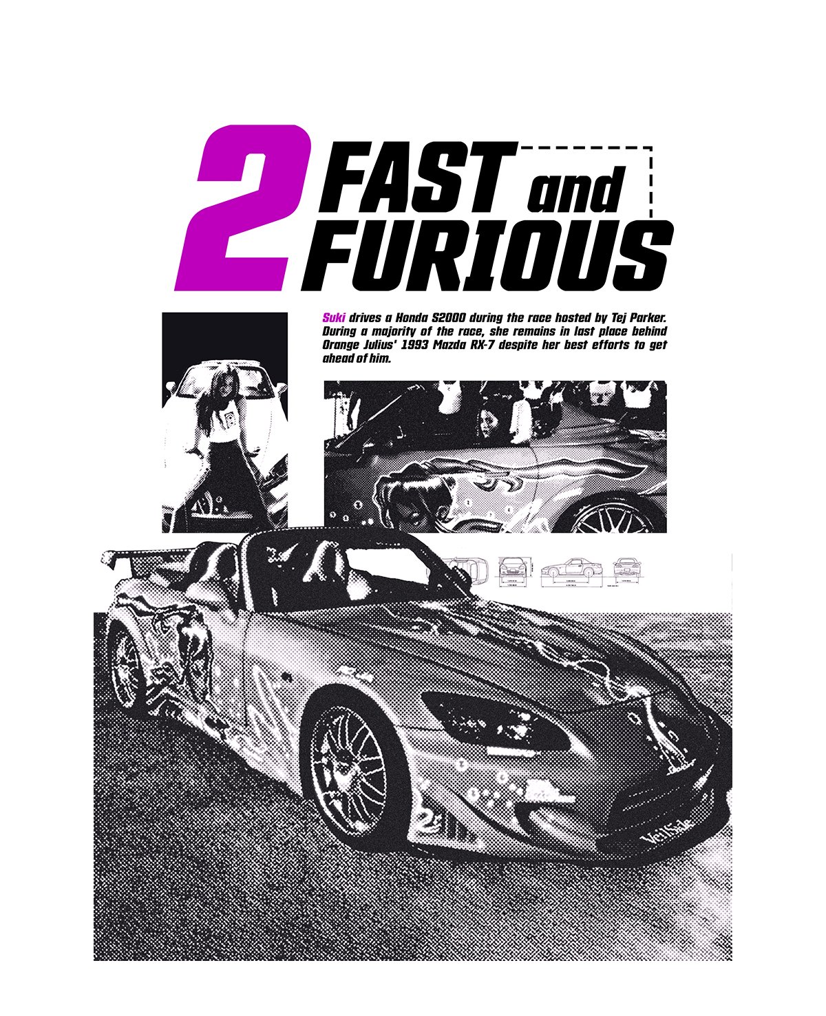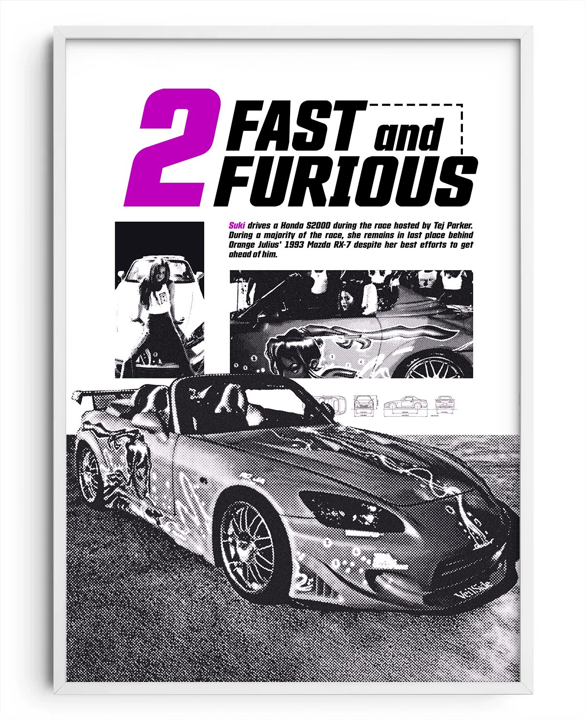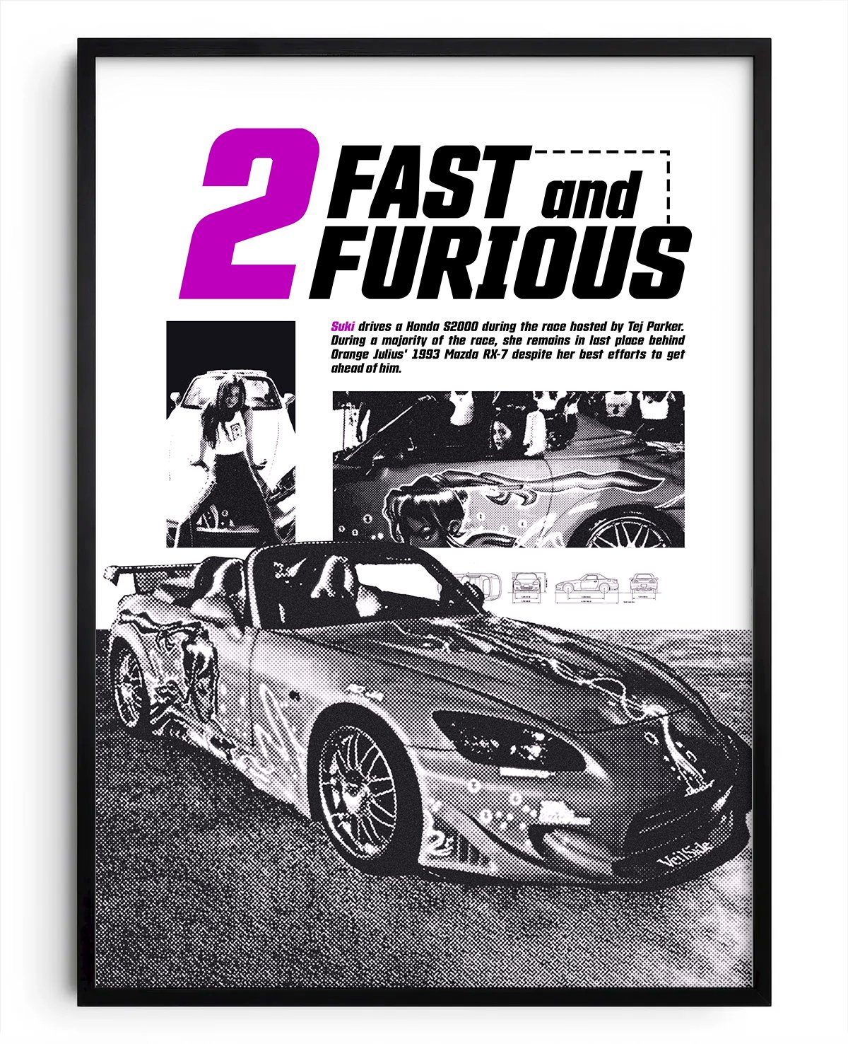 Un póster que revive una de las películas más icónicas de los 2000s. Manteniendo la estética de la época, resalta a Suki y su estilo rosa, junto a los autos que definieron toda una generación. Perfecto para fans del cine, la velocidad y la nostalgia urbana.