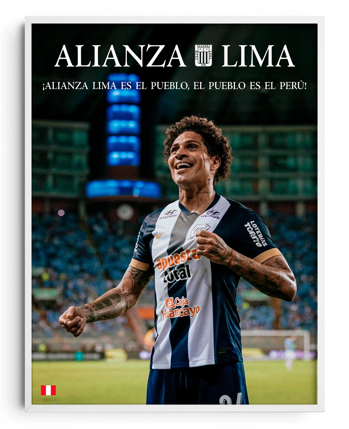 El retorno que paralizó a todo el país. Este cuadro celebra el regreso de Paolo Guerrero, la máxima figura peruana del fútbol mundial, al equipo de sus amores. Una imagen que combina identidad, orgullo y pura emoción blanquiazul.