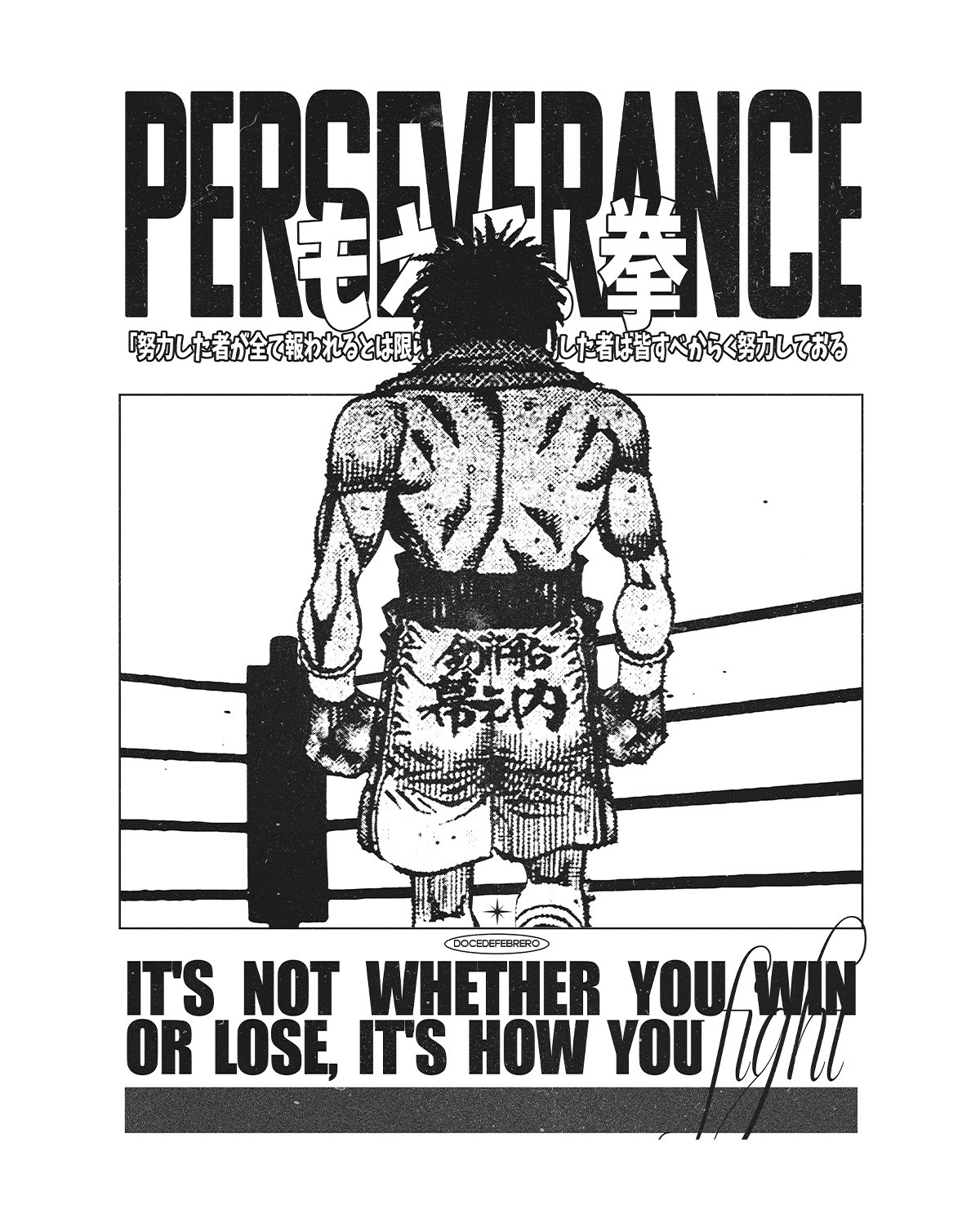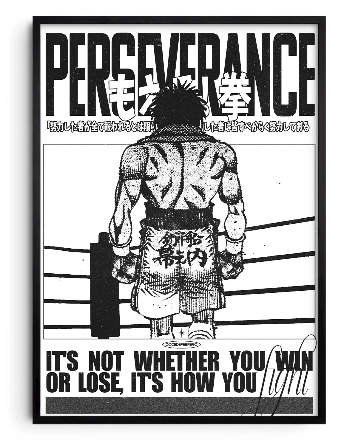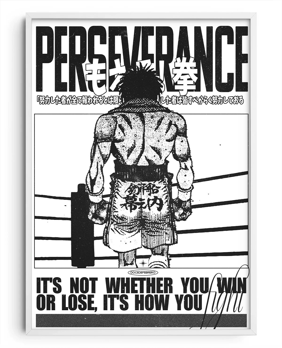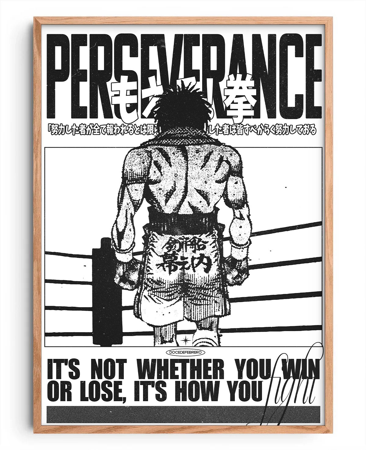 Un póster para fans del anime Hajime no Ippo y para todos los que practican un deporte. Resalta la palabra Perseverance, recordándonos que la constancia, la disciplina y el esfuerzo son clave para superar cualquier desafío. Perfecto para inspirarte cada día en tu espacio.
